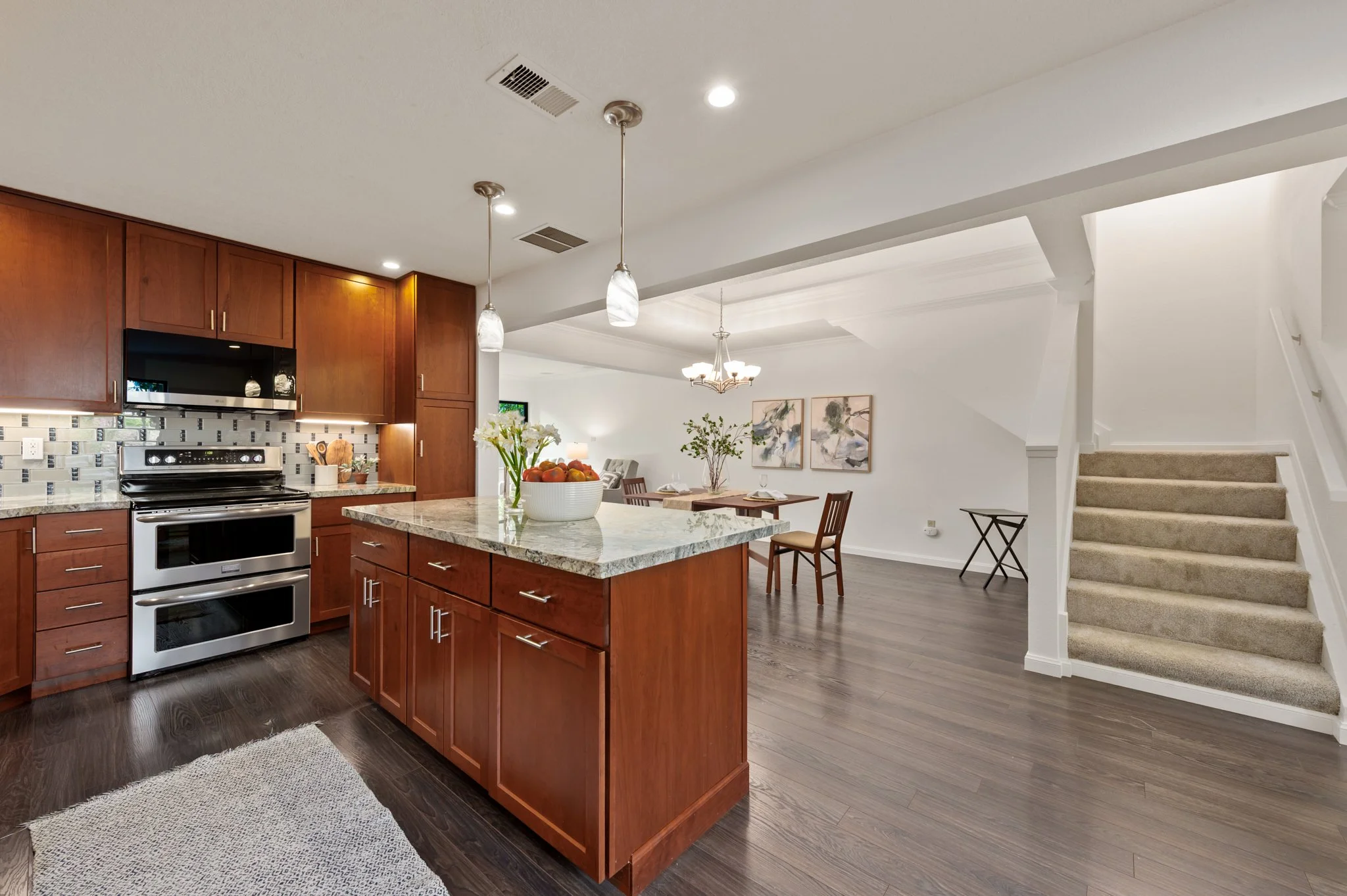 The open floor plan features wood-look laminate flooring on the main level, brand-new carpet upstairs, and a freshly painted interior throughout. The fully renovated kitchen and bathrooms showcase thoughtful, modern finishes, while upgrades including low-maintenance landscaping, recessed lighting, a gas fireplace, a new built-in microwave, and a newer washer/dryer reflect true pride of ownership. New exterior siding was also installed and painted by the HOA in 2025. When you step outside the front door, seamless indoor-outdoor living awaits.