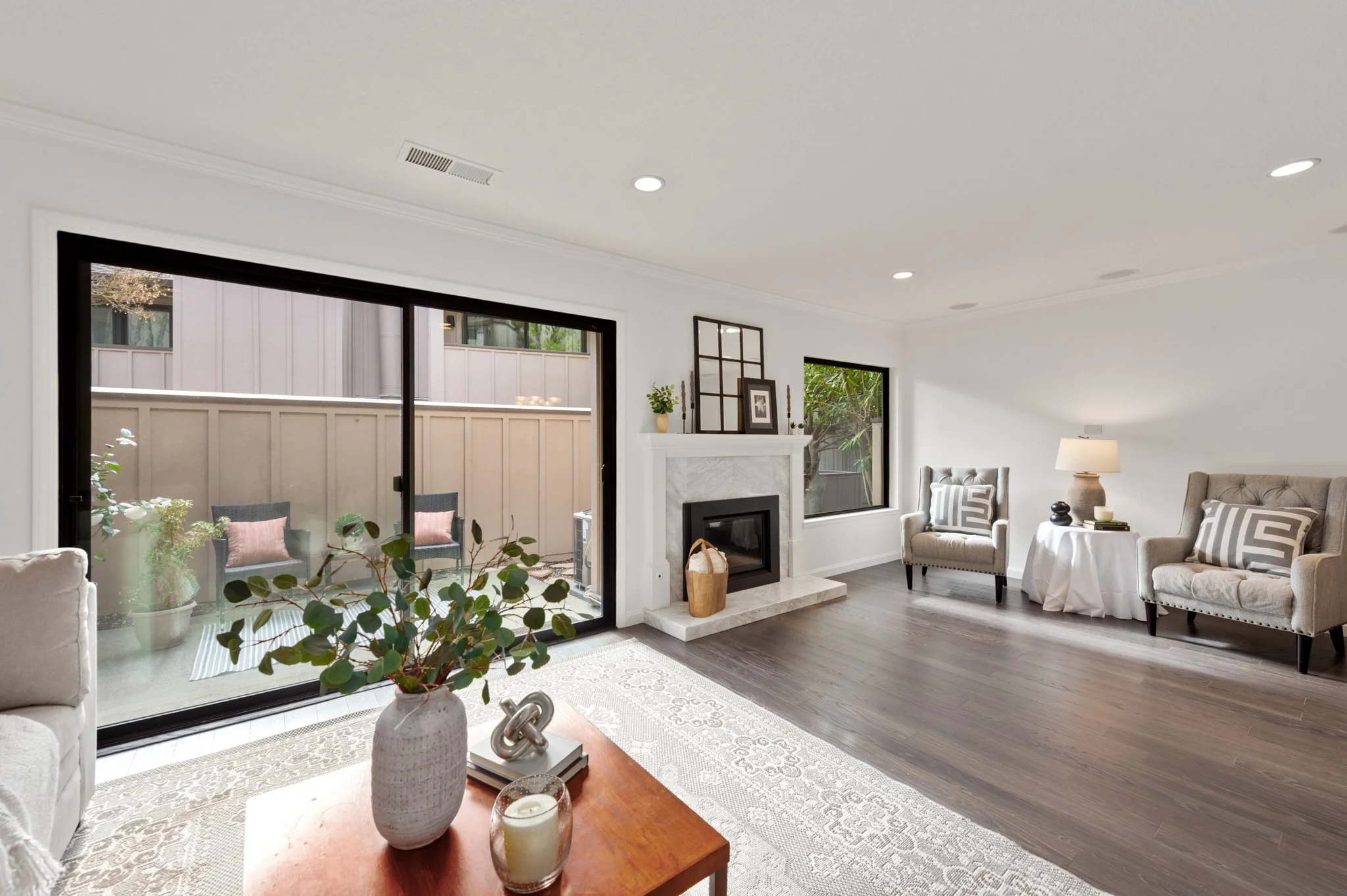 Living room with beige sofa, gray armchair, fireplace, large windows, wooden flooring, potted plants, and modern decor.
